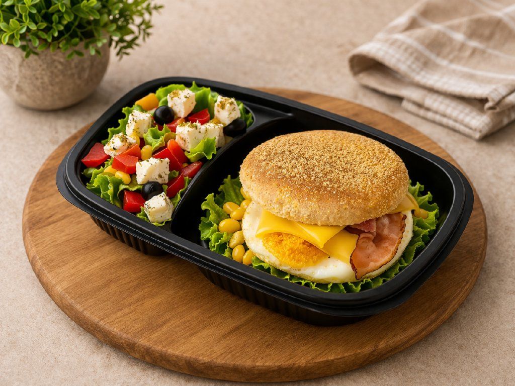 Anglický muffin plněný slaninou, chedarem a vaječnou plackou, doplněný šopským salátem "ala" Ranobox